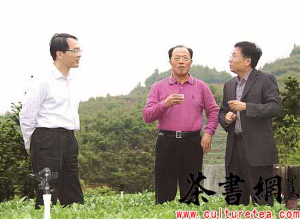 海峡两岸茶业交流协会张家坤会长(中)和安溪县县长高向荣(左)听取八马副总林荣溪介绍八马全国茶叶标准茶园。