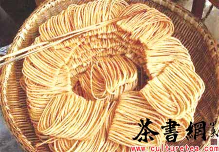 将面粉糅成细条,并成两根下锅炸至金黄色即可。