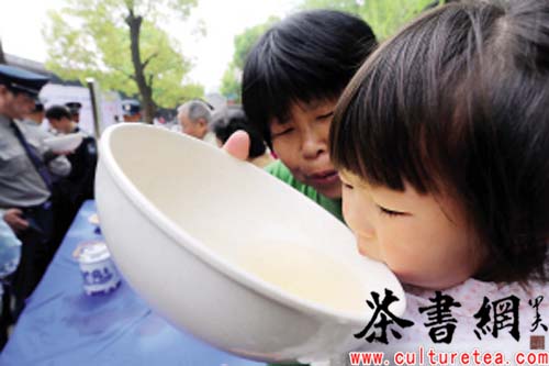 图为一位小朋友端着比自己脸还大的茶碗,把茶汤喝个精光。