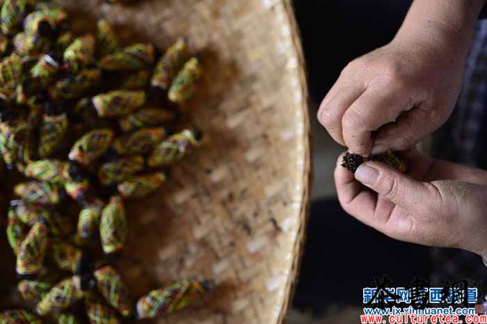 3月28日讯:龙须茶是江西修水县特产的一种手工制作红茶,需要用110到120根茶叶扎成一小捆,然后用四根不同颜色的丝线捆绑包装,因“身披红袍,外形似须”而得名,更因为打开丝线后形似枪头,泡开后又好像一朵菊花,而被称为“杯底菊花掌上枪”。纯手工的龙须茶需要耗费大量人工,熟练工人一天也仅能制作出1斤2两左右。 新华社发