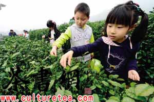 孩子们正在茶园里体验采摘龙井茶新芽。