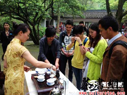 此次“西湖双绝”之旅,广大游客还可以一起炒茶试水,煮茶品茗,欣赏高雅的茶艺表演。山脚下“茶博士”早已为游客摆好了茶席。只见纤纤素手拿起银壶以刚沸腾的虎跑泉水稍凉置后再注入杯里,但见杯中扁形芽叶直立,一枪(芽尖)一旗(嫩叶),徐徐舒展,缓缓摇曳着下沉。仔细端详那舒开的碧绿芽叶与嫩绿的茶汤相交辉映,一派春的生机,春的昂然;杯端升腾的水气空濛中透出缕缕似幽谷之素兰馨,若田野之豆花香。茶未沾唇,早己被春的清新气息而陶醉。捧杯品饮,正如清代茶人陆次云评价龙井茶所言:“啜之淡然,似觉无味,饮过之后,觉有一种太和之气,弥沦于齿颊之间。此无味也,乃至味也。”前来的南北游客品过之后,无不啧啧称赞。趁着春天,何不来虎跑感受下此等公卿雅事?