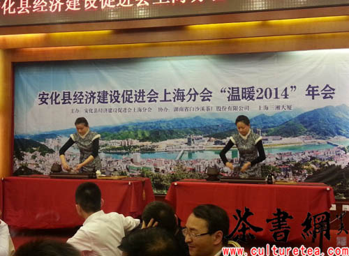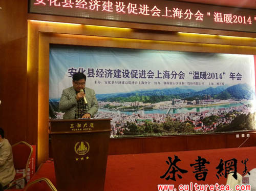 安化县政协主席李太源、武警上海政治学院副政委肖跃华、安化县政协副主席王运明、安化县政协秘书长廖小甫等领导及企业家出席此次会议。活动期间,公司王双如副总经理代表白沙溪茶厂对年会的顺利召开以及助学基金的成立表示热烈的祝贺,同时也将白沙溪黑茶近年来的发展概况及取得一些辉煌成绩向在沪安化老乡做了简要的介绍,引起了与会人员的热烈反响。“白沙溪”产品及文化宣传元素贯穿全场,凭借着其悠久的历史和厚重的黑茶文化成为此次大会的一大亮点。