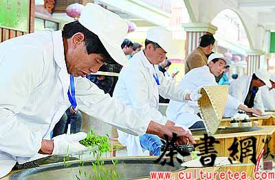 4月15日,浙江新昌县的20名炒茶能手在角逐“茶王”。当日,2014中国茶叶大会的重头戏——大佛龙井茶王大赛的决赛在浙江新昌中国茶市内举行。 新昌是中国名茶之乡,大佛龙井茶等名优茶产量4055万吨,全县18万茶农因茶致富