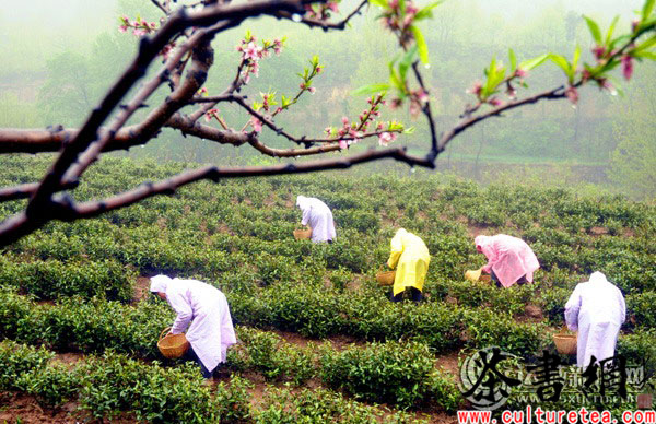 4月15日,山西垣曲县舜茗种植合作社组织人员冒雨采摘春茶。