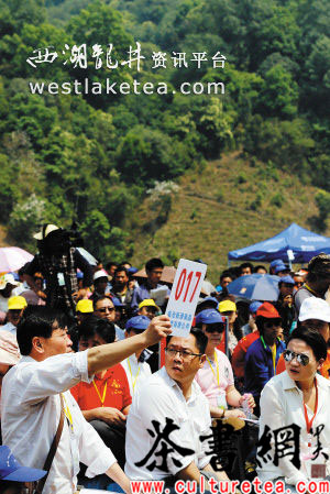 1800元、1900元、2000元……5000元、10000元、11100元……首款拍卖的茶品即受到激烈竞争,200克/盒的单价在短短数分钟内连续翻番,经过数十轮来回应价,最终被一位茶友以每公斤超过5万元的价格一举拿下。