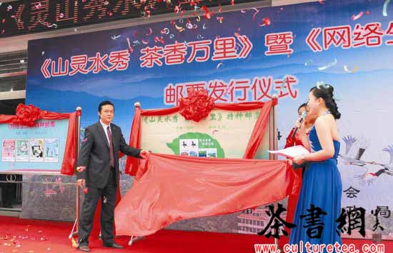 为庆祝第二十二届信阳国际茶文化节,市邮政局、市集邮协会于昨日在东方红大道举行《山灵水秀 茶香万里》邮票发行仪式。据了解,《山灵水秀 茶香万里》邮票是中国首枚茶叶型邮票,由我国著名邮票设计家、美术家刘钊先生设计,以茶叶为邮票形状,以信阳鸡公山、南湾湖、灵山寺、汤泉池四个主要产茶区的风景名胜为图案,配以苏东坡对信阳茶的著名评价“淮南茶 信阳第一”,反映了信阳山好、水好、茶好的特点。