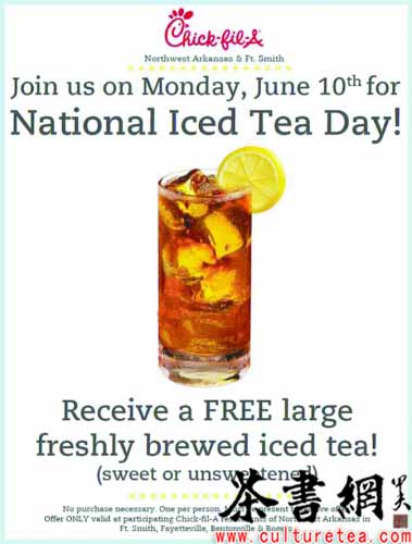 就在冰茶节当日,美国茶企Teavana在亚特兰大州的所有店铺向每位客人赠送一杯明星产品——蓝莓味茶汽水。而且Teavana的官方脸书(Facebook)还会把这次赠饮活动公布出来,喜爱Teavana的顾客可以通过各种方式将活动广告打印出来,凭其现场领取茶汽水。美国德克萨斯州的圣安东尼市的Teavana也在各大购物中心举行此活动。