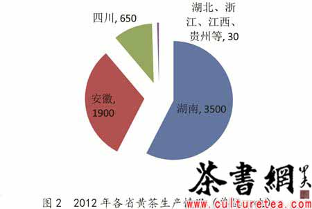 根据调研结果显示,2012年我国黄茶总产量约为6080吨,占全国茶叶总产量的0.34%。其中,湖南(3500吨)、安徽(1900吨)、四川(650吨)三个省份的黄茶产量合计占全国黄茶总产量的99.5%。(见图1)