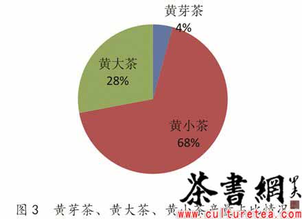 按照鲜叶采摘顺序和鲜嫩程度,黄茶可分为:黄芽茶、黄小茶和黄大茶。其中,黄芽茶主要以君山银针、霍山黄芽、莫干黄芽等单芽茶为代表,其年产量约为260吨;黄小茶则以北港毛尖、沩山毛尖、远安鹿苑、平阳黄汤等为代表,年产量约为4120吨;黄大茶主要包括霍山黄大茶、广东大叶青等,其年产量约为1700吨。(见图2)