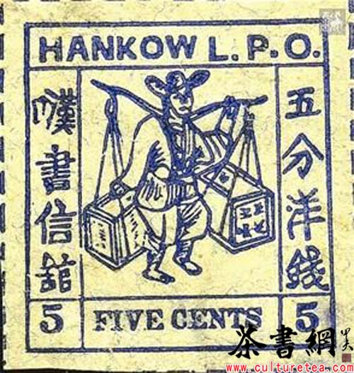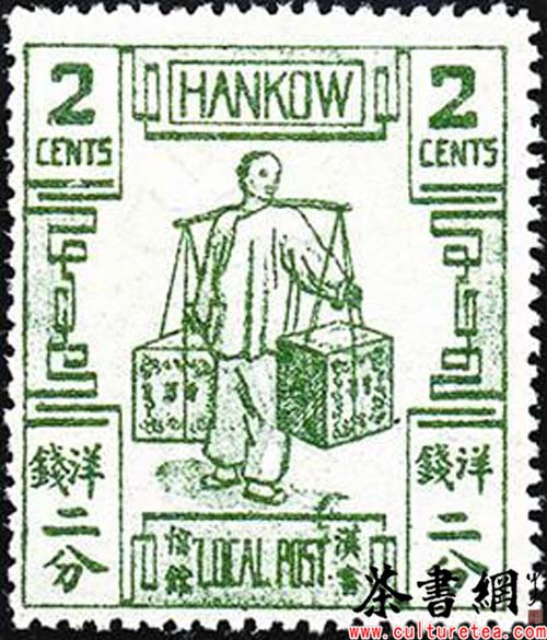 1893年1月1日,汉口工部局接手上海书信馆在武汉的代办所,建立汉口书信馆。汉口书信馆从1893年至1897年发行的“汉口1”至“汉口10”邮票中,除“汉口7第五版普通邮票加盖改值”邮票外,其余9套均采用了一个挑着砖茶箱子的脚夫(老汉口人称脚夫为扁担)“担茶人”的形象作为邮票图案。“担茶人”的形象作为邮票图案,在早期邮票中是仅汉口独有,从一个侧面反映了当时汉口茶市盛极一时的境况。