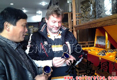 随着茶叶贸易的不断扩大,如今在芜湖市三山区峨桥茶市经常可见外国客人的身影。春节临近,素有“江南第一茶市”美誉的峨桥茶叶批发市场迎来了销售旺季,吸引了各地茶商前来采购。上图为1月2日,一位来自德国的客人在峨桥茶市挑选茶具。