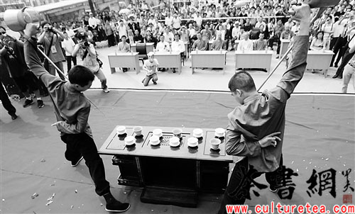 重庆江北区南桥寺市茶叶专业批发市场大门口,两名茶博士正在进行茶艺表演。