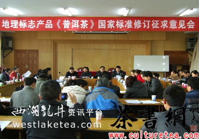 地理标志产品《普洱茶》征求修改意见会议在昆明市蓝天宾馆举行。就《地理标志产品普洱茶》国家标准的修订展开讨论,征求各企业、有关单位、普洱茶标准制定者等意见,提出标准修订基本方案。