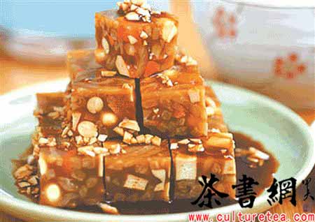 烧一锅开水,先放进去花椒大料包、葱段儿、姜片煮一会儿,再下入焯好的肉皮,先旺火后微火,等到肉皮软了,捞出来切成小方丁儿,顺便把葱姜和料包捞出来扔了。这时候再把胡萝卜丁儿、白豆腐干丁儿、水疙瘩丁儿和肉皮丁一起推到肉皮汤里,再加上盐、酱油、料酒煮上一刻钟,离火后倒在盆里,放到院子里盖好了晾着。过上一宿,凝成了冻儿,就大功告成啦!吃的时候切上一盘儿,酱红的颜色透着庄重,吃起来清凉嫩滑, 再点上一点腊八儿醋,渗起酒儿来,比大鱼大肉更为美妙。