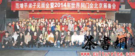 范增平弟子北京见面会暨2014年世界同门会北京筹备会此时正在老舍茶馆举行。原全国妇联副主席、著名社会活动家、翻译家林丽韫出席活动并致词。她说:茶文化是中华文化的载体,茶文化中“和”之精神有助于和谐社会的构建,而建立一个没有战争的和谐世界,正是你我美丽的梦,中国的梦。原北京市外事服务职业高级中学校长迟铭参加活动。