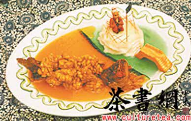 本菜选景红鱼池,其为全园的主景。鱼乐园中放养着数万尾金鳞红鲤,游人在观鱼池的曲桥上投入食饵或鼓掌相呼,群鱼便从四面八方游来,纷纷跃起。此菜一边是翘首欲跃的红艳火鲤,一边是独坐桥上的垂钓长者,神态一动一静,色泽一浓一淡。在品尝爽口绵香的鱼肉时,把鱼之乐、人之情的意境,也一并体味了。