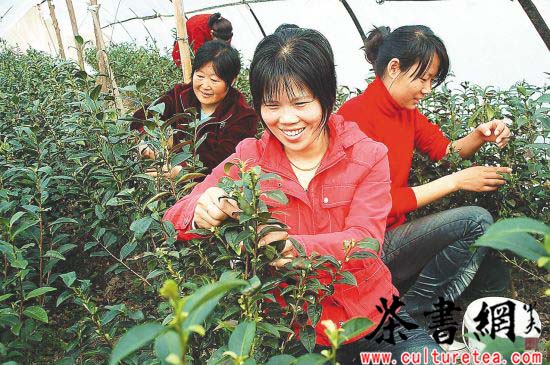 春寒料峭,多数茶园的茶芽仍未完全抽出,而江苏东海县农业合作社利用沼气池产生的沼液、沼渣追喂绿茶,既使大棚绿茶防寒保温和无公害,还确保早春提前采摘。图为茶农在采摘新年“春前茶”。