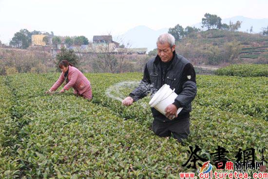 周宗步是点头镇的一名普通的茶农,经营着8亩的高产“福鼎大白茶”。2月12日,笔者在他的弯后里茶园看到,他正与雇请的2位村民为茶园喷施催芽肥, 周宗步告诉笔者,目前的阴天天气比较适合施撒催芽肥,目前每天施肥2—3 亩,如果不遇大雨天气,大概还需1—2天就可全部完成。