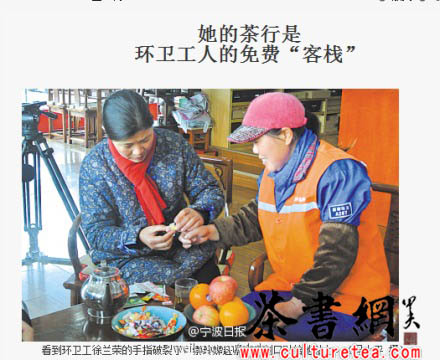 从2006年开始,北仑新碶东河路的一家茶行,就为环卫工人免费提供茶水,还专门设置了一个休息的地方,让环卫工人有个舒服的歇脚点。女老板名叫崇玲娣,说看到环卫工每天风里来雨里去的,很辛苦,于是就想着自己能为他们做点什么。