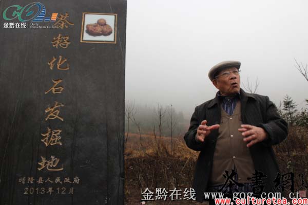 今年已经74岁高龄的卢其明老先生是这块目前世上唯一茶籽化石的发现者,他向我们讲述了34年前的回忆。1958年,从茶叶专业毕业后,卢老先生就来到晴隆县农业局,开始了几十年的茶叶技术工作。此间,他无意中发现这里生长着不少的野生大叶茶,据此断定晴隆的自然环境适合于大叶茶的种植生产,并陆续引进试种了云南大叶茶,得以推广。