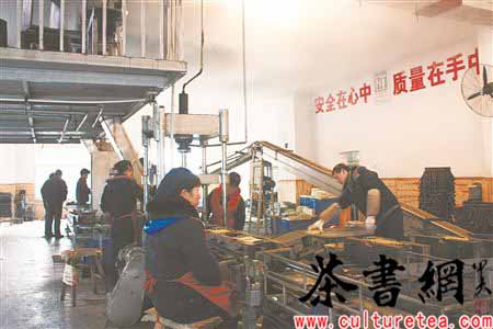茯砖茶生产线更是热火朝天。这条线是公司自主创新设计研制,全自动清洁化回环流水线,生产正品率高,日均产量达6000片以上,曾获得三项国家发明专利。新年开工,便开足马力,全线投入生产。小砖班两条线同时启动,双班轮流生产,日产12000片。为了让下一班员工有较多白天工作时间,上一班的员工总是尽量把时间缩紧,中午吃完饭就开工。员工们熟练地技术操作着,头上冒着热气,茶叶升腾着蒸汽,伴随着机器的轰鸣交响着茶马新春协奏曲。