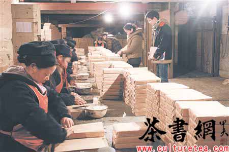 走进包装车间,弥散着恒定的暖流,每个包装台下铺上了安全的暖气管,暖气烘热了包装台,烘热了台面上正在包装的茶,更温暖着包装车间的所有员工。但宽敞明亮温暖的包装间只有小包装产品在少量几个台面忙碌着,似乎空间有点多余。正疑虑间,有位员工告诉我们,她们都在烘房门口。顺着手指方向,另一番景象简直让人惊诧:古老简陋的烘房门前,四通八达,零下几度的气温冷风嗖嗖,低垂明亮的灯光下,一溜排清洁整齐摆开的包装桌,桌面堆满了包装的产品,员工们正在紧张有序地忙着,脸上泛出红红的胭波。原来,春节放假几天累积了包装工作量,而节后加班加点的生产半成品急需进烘,员工们为了加快进度,争取时间,减少中转流程,以最快的速度腾出烘房,早上提前30—40分钟上班,晚上推迟几十分钟下班,还主动搭起了移动包装台。可谓“好马自知争朝夕,不待扬鞭自奋蹄”。