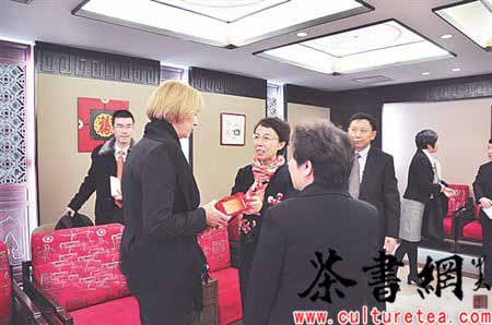 近日,德国科隆副市长何珂一行在北京市副市长程红的陪同下来到全国首个中华老字号聚集区大栅栏商业街进行考察。在“全国茶业首家亿元店”张一元大栅栏店,外宾们了解了张一元品牌的发展历史,一边喝着张一元茉莉花茶这一“国家级非物质文化遗产”,一边还欣赏了张一元高级茶艺师的精彩表演,对中华传统文化表现出了浓厚的兴趣,尤其当看到店内排队买茶的场面时,不由发出赞叹:张一元的茉莉花茶真的很好。图为程红把张一元花茶作为北京礼物赠送给德国客人。