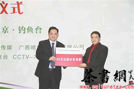 捐赠仪式上,来自福建省武夷山市、湖南省安化县、浙江省新昌县、湖北省赤壁市、福建省福鼎市、安徽省休宁县、江西省修水县、湖北省兴山县、湖南省石门县、山东省日照市岚山区十个重点产茶县的相关部门领导,与湖南省茶业集团、福建省品品香茶叶公司、河南省文新茶叶公司、陕西午子绿茶有限公司等十家自有茶园基地建设较好的茶企领导登台领取了喷施宝公司赠送的叶面肥。每县获赠价值70万元的叶面肥,每家龙头企业获赠价值30万元的叶面肥,合计总值1000万元。