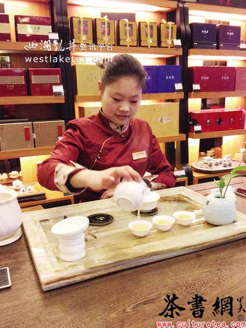 采访中,张郃为我简单地表演了一套茶艺:一是仙子沐浴,即温杯。目的是把本来就已干净的杯子再烫洗一遍,以示对嘉宾的尊敬。二是笑迎佳人,即投茶。三是点水沐兰,即润茶,这有利于茶香的发挥。四是高山流水,即冲水。只见她手提茶壶有节奏地点三下,使茶壶三起三落而流水并不间断,形象地称之为“凤凰三点头”。张郃说这样加水可以使茶叶在杯中上下翻滚,促使茶汤均匀,同时也蕴含三鞠躬礼仪,表示对客人的敬意。而加水至杯子容量的七分是表示“七分茶,三分情”。