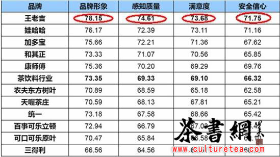 调查结果显示,茶饮料的满意度较之往年有所提升,在选取的11个品牌中,凉茶饮料普遍受到消费者好评,排名前四的茶饮料品牌,凉茶饮料就占据了三大席位。其中,王老吉的单项和综合满意度均居榜首,佐证了王老吉一以贯之的生产经营态度,得到消费者在其“产品质量”和“安全信心度”上的高度认可。