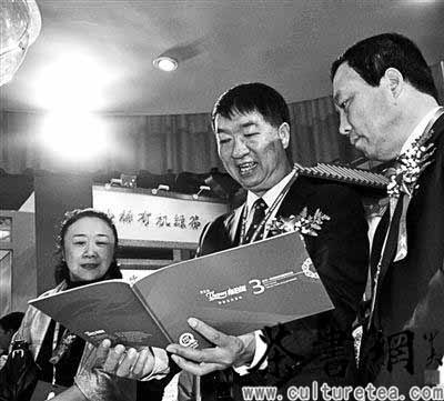 图:2009年10月24日,第六届中国国际茶业博览会上,普洱市市长沈培平(右二)观看普洱茶茶珍宣传册供图/东方IC(1/2张)