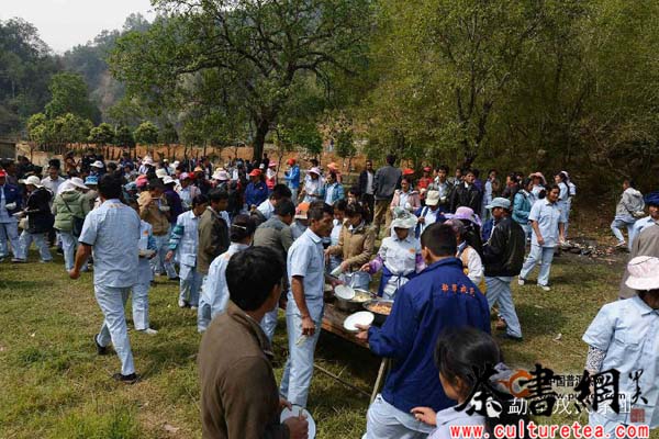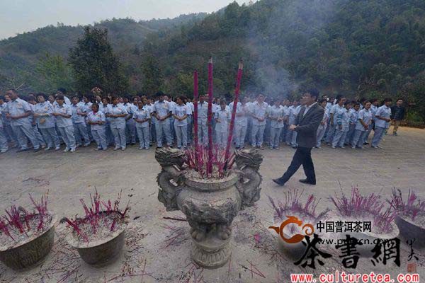 清早,勐库戎氏董事长戎加升先生、副董事长戎玉廷先生及高层管理人员先行祭牲,九时许,核心经销商及合作团队紧随其后,在勐库戎氏主要领导的带领下接棒祭礼。十一点半,盛大场面正式启幕,勐库戎氏员工秩序井然,由戎加升董事长、戎玉廷副董事长主持引导,向中华茶祖神农炎帝进香献牲,整场活动在肃穆端严的气氛中有序进行。十二点正,全员分享祭牲宴后,仪式圆满告终。