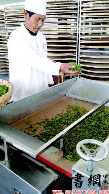 在某茶厂内,一名炒茶工人正将鲜叶投入杀青机