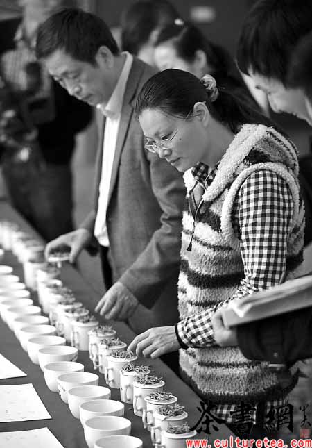 评审组成员正在对茶底质量进行鉴定。