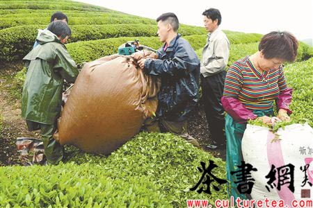 4月20日,多台采茶机在浙江省武义县王宅镇马昂村茶园里赶采谷雨前茶。当日是二十四节气中的谷雨。有12.3万亩茶园的中国有机茶之乡、全国重点产茶县浙江武义,今年缺采茶工1万多人。尽管该县农业局、人劳局、农村合作银行等部门通力合作,组织到外地招采茶工,开展党员干部和志愿者双休日帮茶农义务采茶,还是无法把全县春茶采摘下山。茶农为赶在谷雨前将头茬春茶采摘回来,纷纷新购采茶机代替人工采茶。据茶农介绍一台采茶机只需用工5人,每天能采摘鲜叶5千多公斤,一台机器相当于100多名采茶工采的量。虽然机采质量差些,但苦于采茶工难找,为赶节气只有大面积实行机器采茶。 张建成 摄