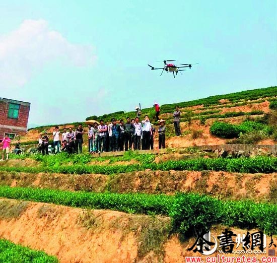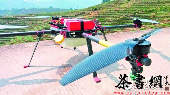 “这种直升机非常适合茶山作业。”广东珠海某飞行器公司的赵经理介绍,这架飞机叫植保无人直升机,名叫“谷上飞”,重约10公斤,飞行速度一秒钟达3-8米,一垄过去,一分钟可喷洒一亩茶园,其效率是人工的20倍左右。