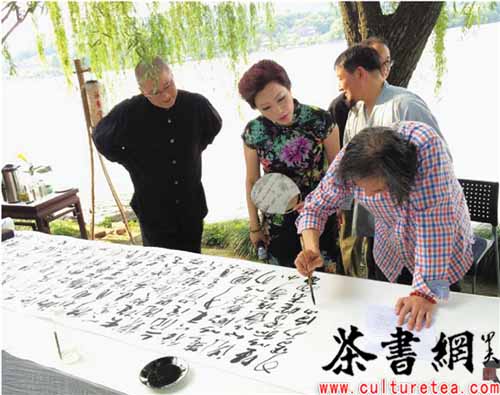 30叶摇橹扁舟里,沉香缕缕,文人雅士180名,喝着龙井,飘向湖心亭。船陆续靠岸,但见身着旗袍的女子手抱琵琶,坐在湖边弹拨《春江花月夜》。文人骚客就在这乐声中,题字、作画、品香、问茶。