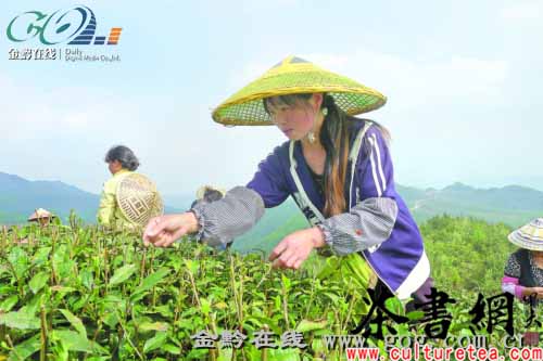 我们顺着茶园的水泥小道爬上山顶,几位姑娘正在采茶。布依族姑娘莫泽艳戴着斗笠,背着竹编的“腰箩”,灵巧的双手在茶丛中点采,犹如蜻蜓点水。“每天能采到一斤茶青,工价就是150元,如果是熟手,收入会更多。”这位来自都匀郊区农村的姑娘说。