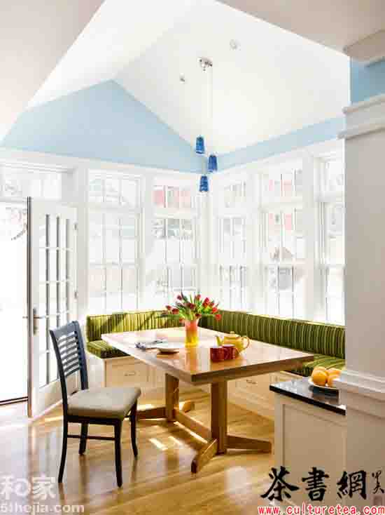 转角沙发缔造的早餐区,同样也是下午茶的好去处,充足的阳光格外温暖。绿色绒布沙发垫,通过颜色的魔力巧妙激活了角落,接着便是装饰,蓝色清透玻璃在提供光照的同时自身也是不错的装饰;大大的通体玻璃窗给室内带来全方位的自然光照,舒适至极。